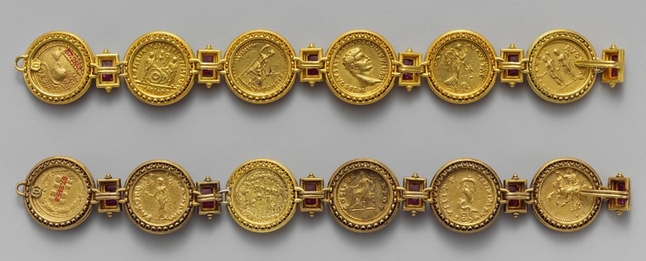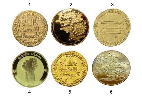 Sometimes it is hard to tell what is gold and what is not. Sometimes jewelry is not marked. There are three gold coins mixed in the following six coins . Can you tell which ones they are? The first, third, and fifth coins are gold. They vary in shade and depth of color but all three are gold Dinar from the second century of the current era. Coin number two is a modern, gold-plated, copper-nickle coin from Australia. The fourth coin is a nickle-brass commemorative coin from Albania, and the sixth coin is a bronze token from Hampton Court Place.