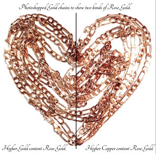 Rose gold is an alloy of copper and gold. Again look for the karat weight of gold in your jewelry. 24K rose gold is more golden than pink whereas 12K rose gold is more pink than golden. Although we are not good at photoshopping we hope the image below will give you a general idea of two Rose Gold tones.