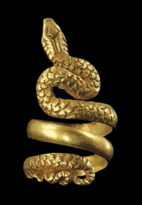 The Gold Hellenistic ring dates back to 100 BCE, yet despite its age, the style is on point. Many ancient Greek snake pieces exist but we decided to share this one because it is home again, in the Benaki Museum in Athens, Greece. Forged, cooled and wrapped around a cylinder, this gold became a ring. The snake scales and stripes at the end of the tale are hand carved. The fold that forms the snakes first curve, and the many folds at the end are created by manipulating metal as it cools. Of course, we will never know exactly how the smith made the ring, only that Hesphaestus helped him at his craft.