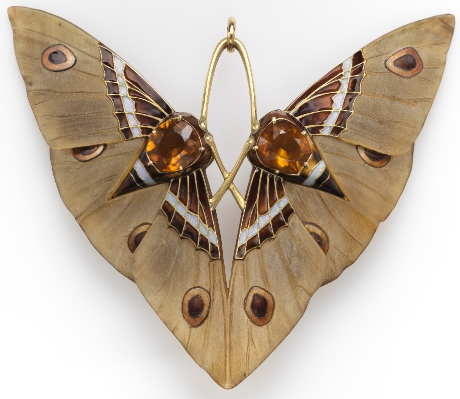 Lucien Gaillard made this stunning moth pendant in 1900 in Paris, France. After taking over the family jewelry business, Gaillard refocused the firm’s attention on metal-working. Luckily, a decade later he returned to jewelry. The soft looking moth pendant you see above is actually a combination of metal, bone, precious stones, and enamel. There is nothing soft about this delicate beauty.