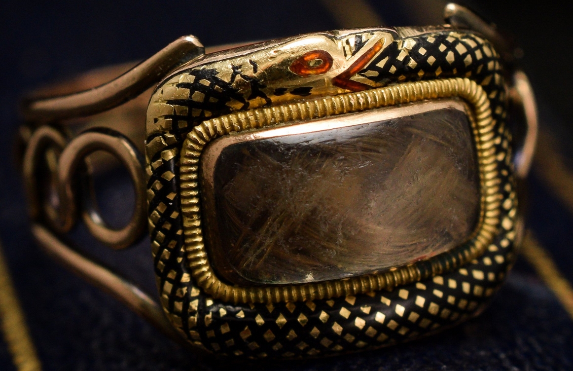 John Wilkinson made this locket in 1826 in Leeds, England. Today this display of affection for the deceased is generally frowned upon. Lacking photography, family members chose to keep a touchstone of their beloved as a memento. Not only did the jewelry serve as a memory of the deceased, it also served to remind the living that life is short. From Erica Weiner’s Antique Jewels we have a gold mourning ring with a lock of plaited hair mounted behind curved glass.