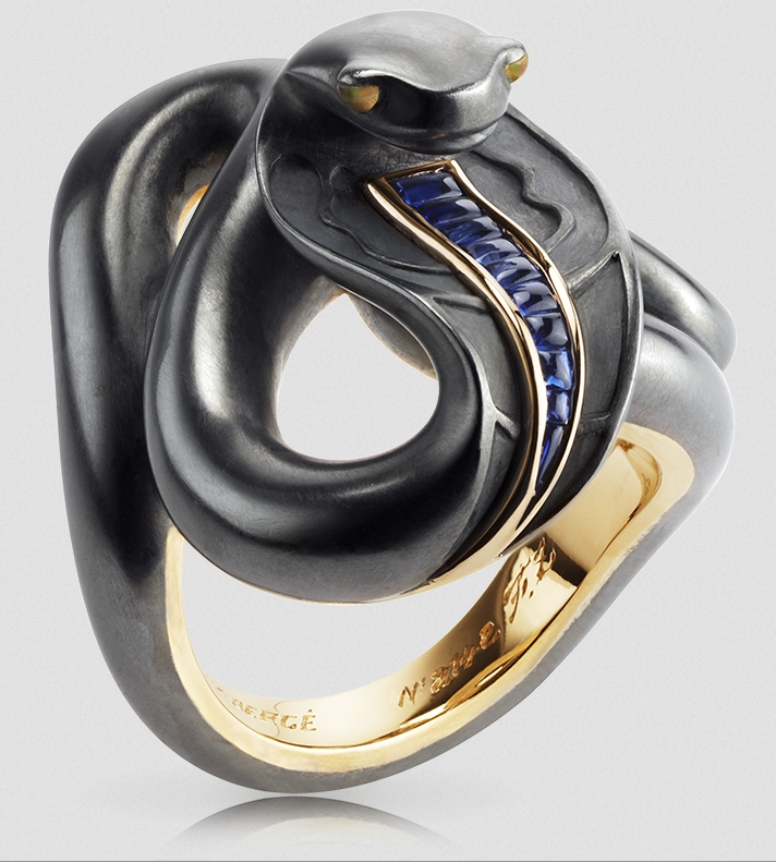 Frédéric Zaavy of Fabergé designed this fantastic and fang-less sea serpent. The black exterior is most likely toned sterling silver. The ring also contains white gold, yellow gold, opal eyes and beautiful inlaid sapphires in the center of the extended hood. Zaavy was inspired by the nemesis of many Russian fairy tales. As is often the case, a hero must follow the call of adventure. While he is away, the shape shifting sea serpent abducts his lover and there is nothing the hero can do. The girl-stealing sea serpent is a common enemy in may Russian fairy tales, and here, Zaavy has brought the alluring enemy to life.