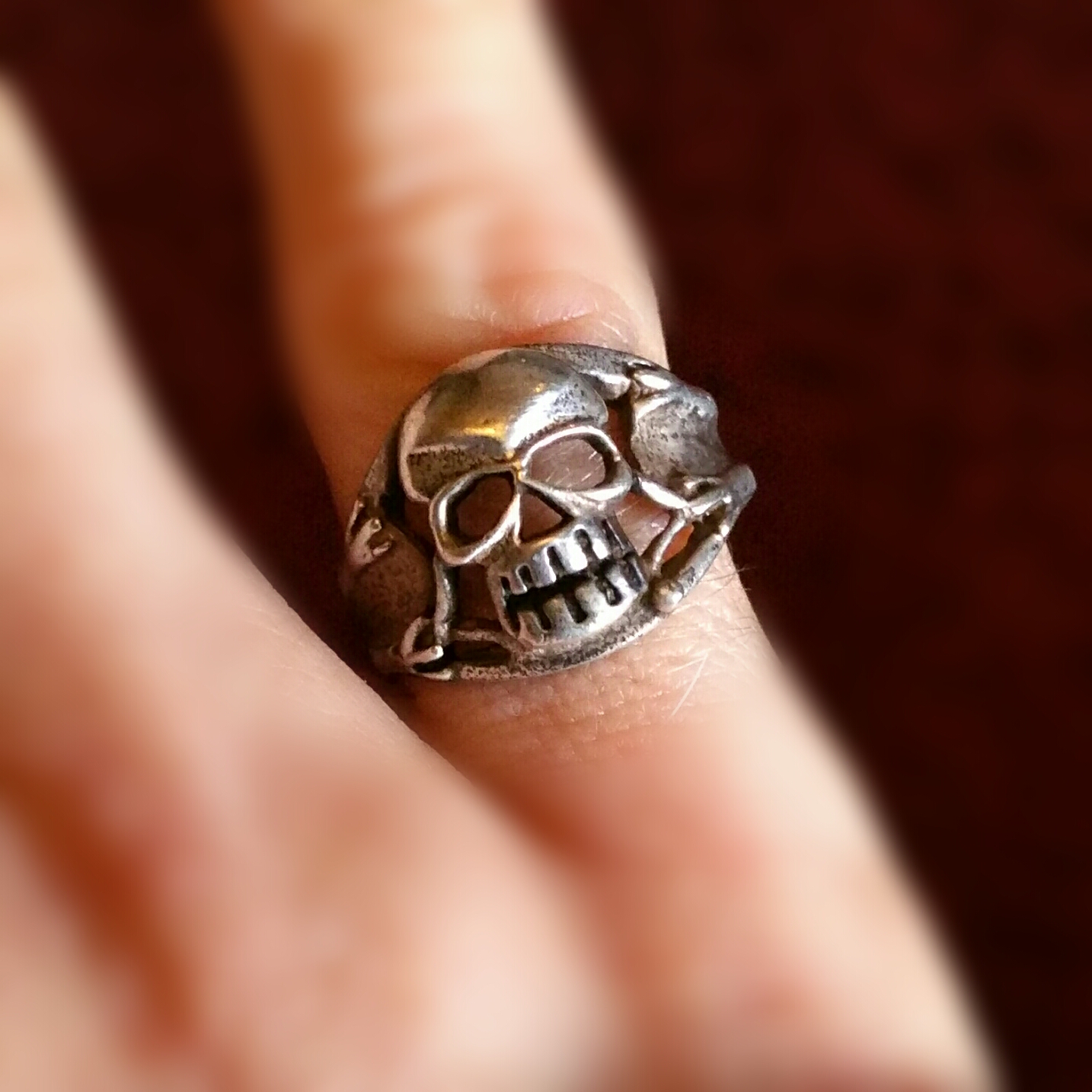Here we have a .999 fine silver antique French skull ring. The patina appears organic, especially when viewed in light of the micro-scratches on the raised surfaces of the skull. In this example you can see how the patina gathers in crevasses and slowly fades as the surface protrudes. There are no sharp defining lines between the patina surfaces and shiny surfaces which indicates it is naturally occurring.
