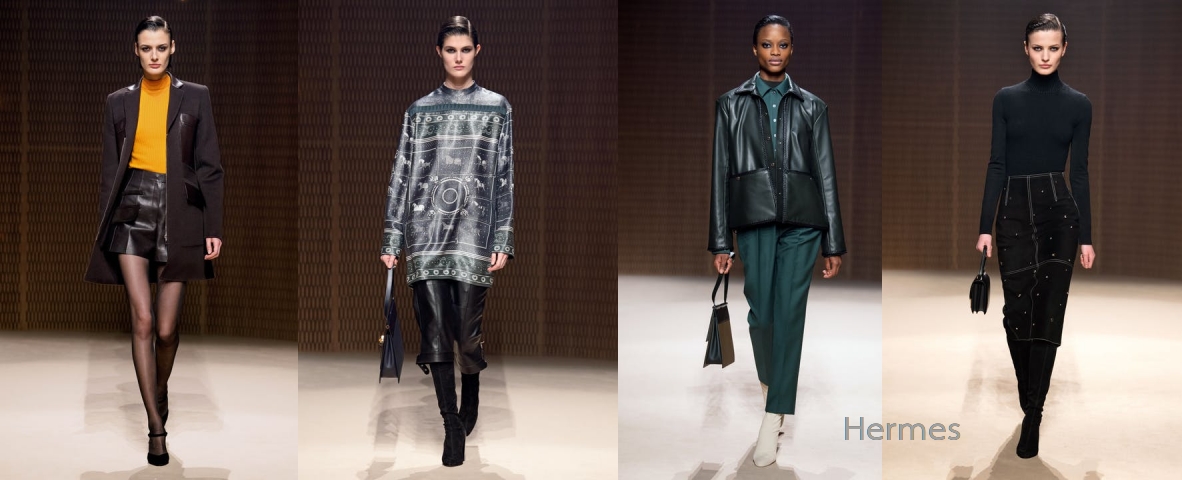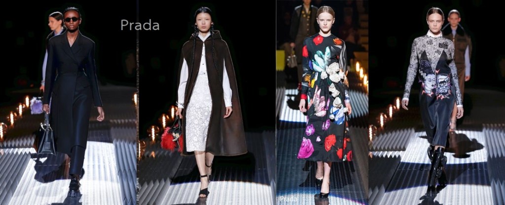As stated in the first instalment, black is back. Each show included a great deal of black as an accent, and in all but Fendi and Hermes, as a main clothing color. Fendi and Hermes favored dark patterned fabric combinations instead of black monochromatic sets. Sheer and lace items accentuated every runway and stole the show in the Prada lineup where lace capes paired with combat boots provides a fresh look for the powerful feminine vibe.
