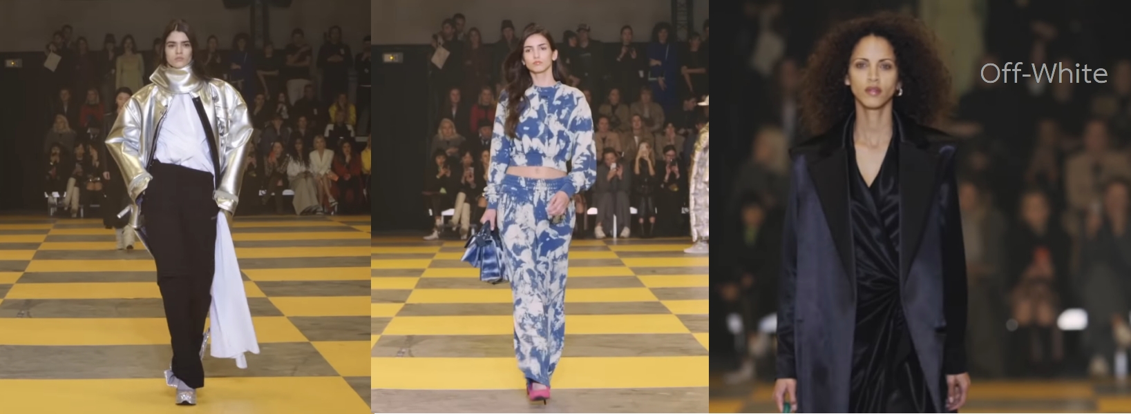 Every show had a sparkle of silver: Prada paired silver and blue (3:56) and walked in silver shoes (5:24, 5:58), Hermes wove with silver sheen (2:28), Valentino rocked a silver statement collar (6:50), Off-White sported a silver jacket and shoes (1:39), and Balenciaga strutted in silver lame trousers (16:04). Even Fendi, who adhered religiously to gold hoop earrings, belt buckles and purse chains could not prevent the luster of silver sheen in the sparkle of perfect plum fabric (5:52), nor shining silver trim (7:56) on a sheer dress ensemble. Fendi even provided silver-gray wigs for some of the models.