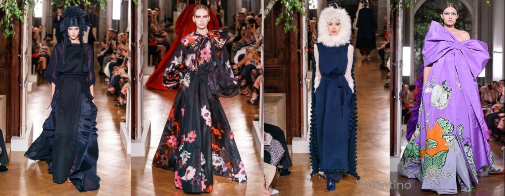 As with the previous shows, these had many variations of sheer and satin fabrics. Monochromatic outfits with fur, feather, and sheer accents glided down the runways. Asian-inspired details, turtlenecks, mock-turtlenecks, shades of blue from navy to baby blue, and soft rich fabrics like chenille invite us to indulge in some hygge time this fall.