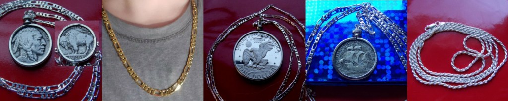 From Honored Allies on eBay, we have two chains; one silver chain and one gold plated chain. Plus, three coin pendants for Dad. An American Classic Wild Wild West Indian and Buffalo Nickel Coin Pendant. A Commemorative Moon Landing Half Dollar Coin Pendant. And an Antique Portuguese Ship for the Pirate Dad’s out there!