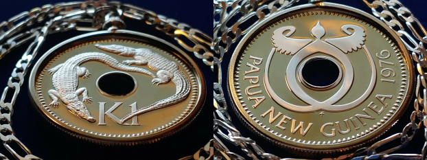 The 1 Kina, is equivalent to about $0.29 USD. The obverse of the 1 Kina, holed-coin is different than the previous two in that it features a stylized version of the Bird of Paradise which just happens to be the Bank of Papua New Guinea logo.