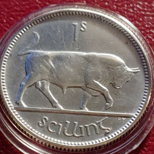 Also in 1928, the London mint began producing 1 scilling (shilling). They have an Irish moiled bull on the reverse. The moiled is the last of the native breeds of Irish cattle. This coin was initially minted on a silver planchet but in 1941 the war effort demanded the silver so the coins were no longer minted. Then, in 1941 the 1 scilling was minted again, but this time the planchets were made of copper-nickel.