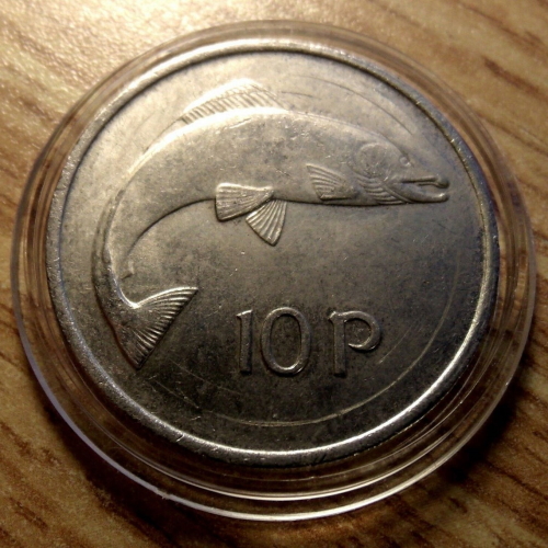 The 2 scilling, 1 Flóirin, was minted from 1928 to 1968. It too was initially silver and after the war is was copper-nickle. The post-war Florins are also a tenth of a millimeter larger than their pre-war predecessors! The Salmon on the coin was once an abundant source of food for the local population. Some Salmon still run up the rivers just North of Galway, although their numbers are nothing like they used to be!