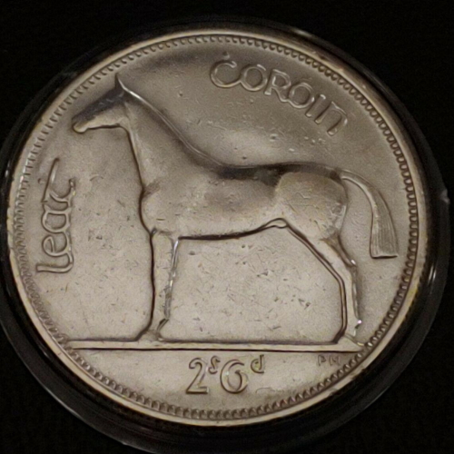 The last coin of this Irish Animal tour is the 1/2 Coroin, equal to 2 scillings and 6 pingins. The 1/2 Coroin has the sturdy and feisty Irish Hunter Horse on the reverse. This breed was developed by crossing the hard-working Irish draught horse with the agile English thoroughbred. The coin was minted from 1928 – 1967, initially in silver, and then in copper-nickel.